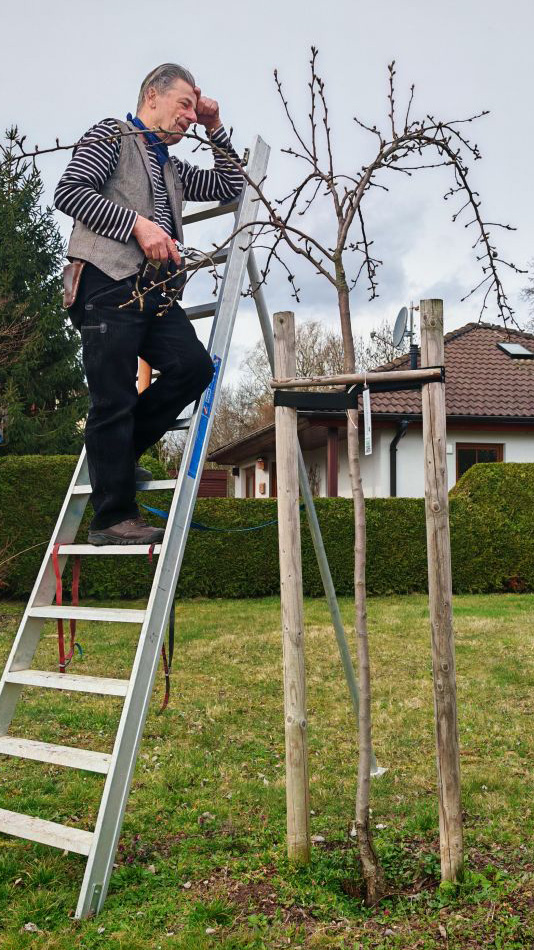 Als Übungsobjekte dienten uns rund acht Obstbäume, die wir bereits im Jahr 2022 gepflanzt hatten. Jörg war ehrlich zu uns und wies darauf hin, dass der bisherige Wuchs eher ungünstig verlief und ein sogenannter Erziehungsschnitt schon viel früher hätte stattfinden sollen.